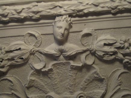 zu Blütenrosetten. Die Achsen der Decke werden durch die Bekrönung dieser Felder aufgenommen: Eine Muschelschale, gerahmt von Akanthuslaub, geht über in eine Büste mit leicht schräg geneigtem Kopf, deren Schultern Blütengehänge entwachsen.